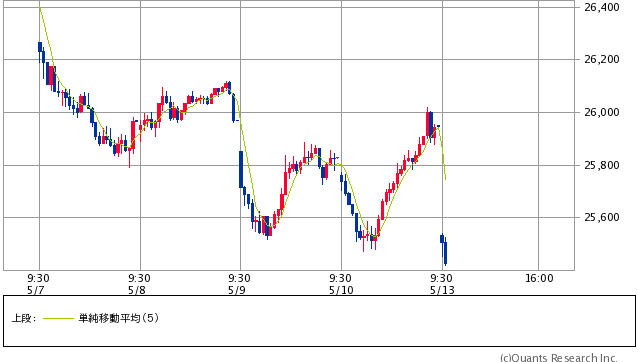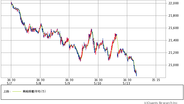 5/13 23:00過ぎ現在のNYダウ、日経平均先物の値動きを見ると、明日は安く始まりそうではあります。さて、どうなりますか。